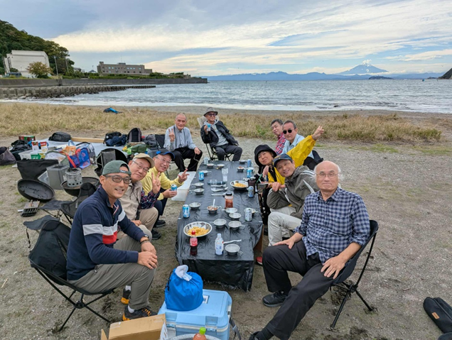 その後は港から徒歩で逗子海岸へ移動し、富士山が海に浮かんで見えるような絶景を背景に、BBQ懇親会を開催。香ばしい炭火焼きとともに会話が弾み、アルコールも進み、和やかな雰囲気の中で閉会となりました。