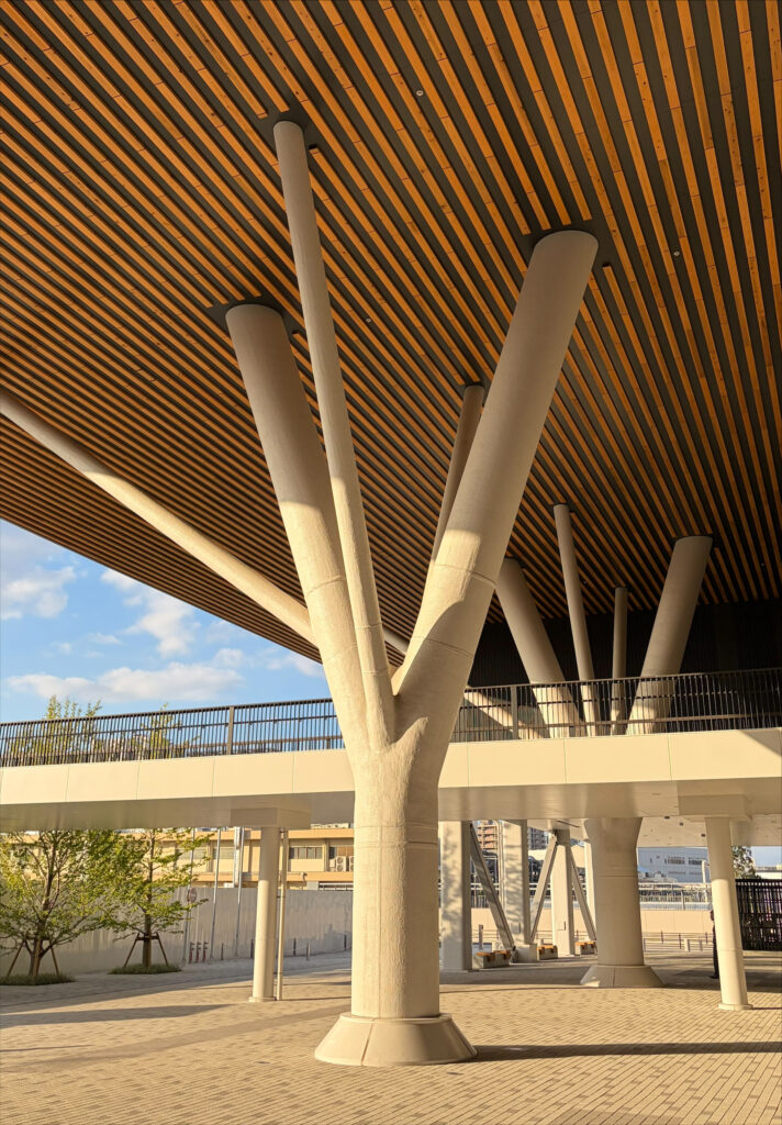 また、建物の下の方を見ると、木の枝状に伸びた柱が何本も置かれています!こちらは「樹形柱」と呼ばれており、建物内に貫いてライブラリー、図書館まで伸びているそうです!🌳🌳