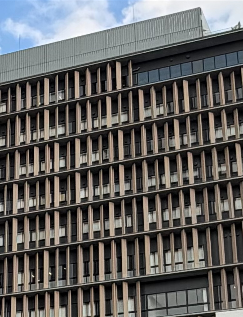 キャンパスはスタイリッシュな外観です!ここで、外壁より外側の大部分には木の板が不規則な向きに並べられているのを発見しました!