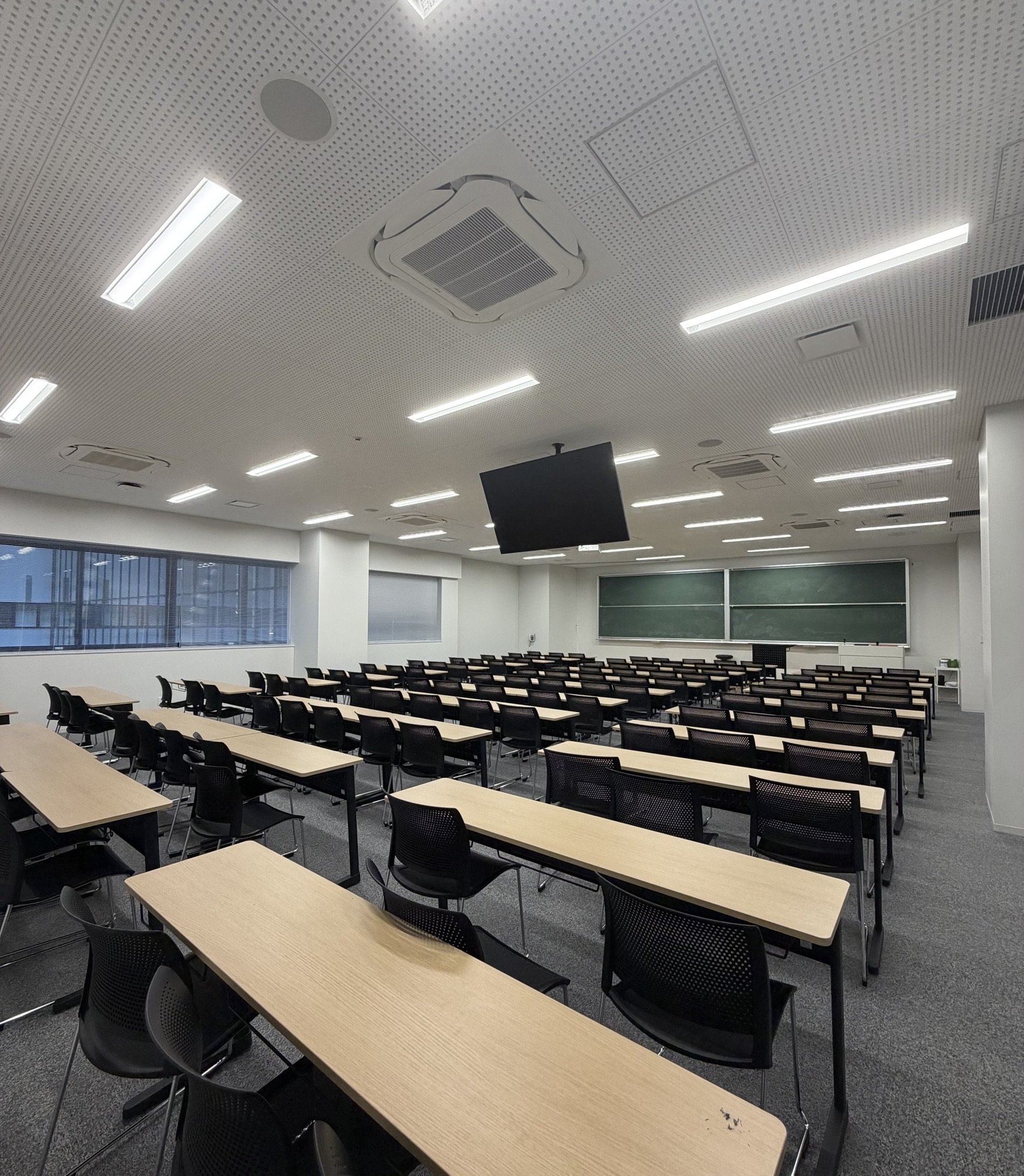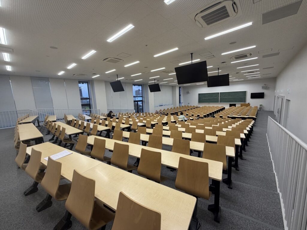 ご覧ください!1枚目が中教室、2枚目が大教室ですが、奇麗すぎませんか??映像授業のためのスクリーンがあり、座席もゆったりしており、非常に過ごし心地が良さそうな教室です!✨✨